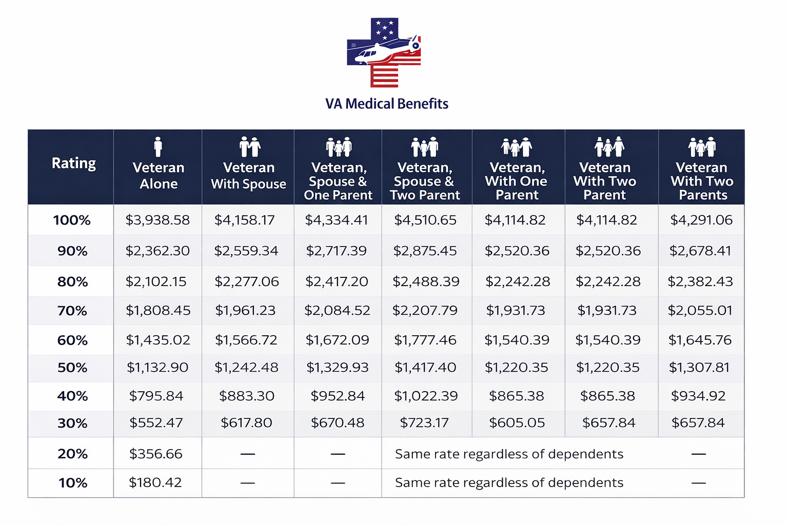 The chart below outlines monthly VA disability compensation amounts based on disability ratings and dependent status. These figures are set by the VA and may be updated periodically.